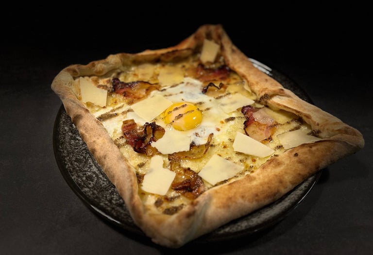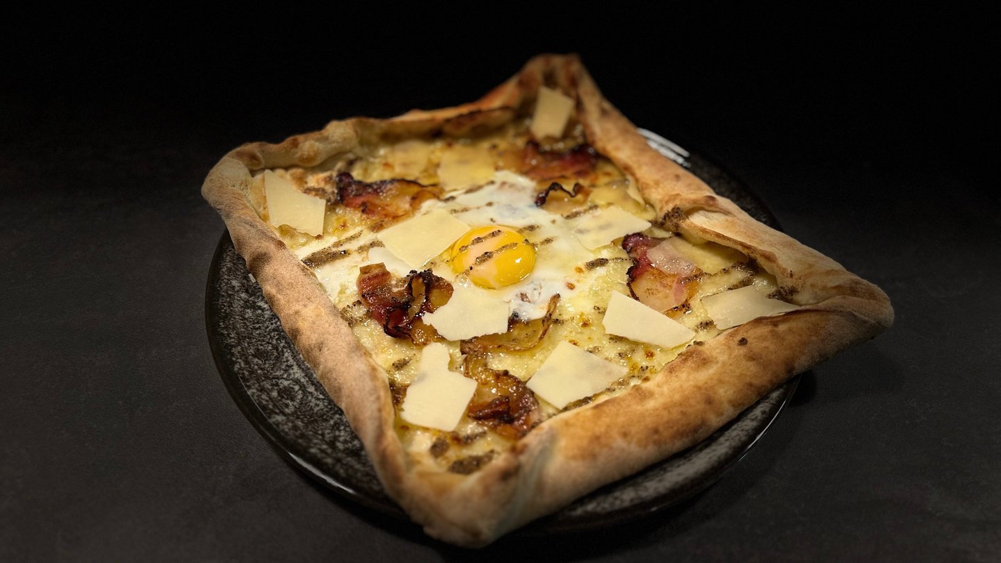 Mozzarella, guanciale croccante, uovo, ''a fine cottura'' salsa di tartufo della Lessinia (fatta in casa), scaglie di Grana della Lessinia.